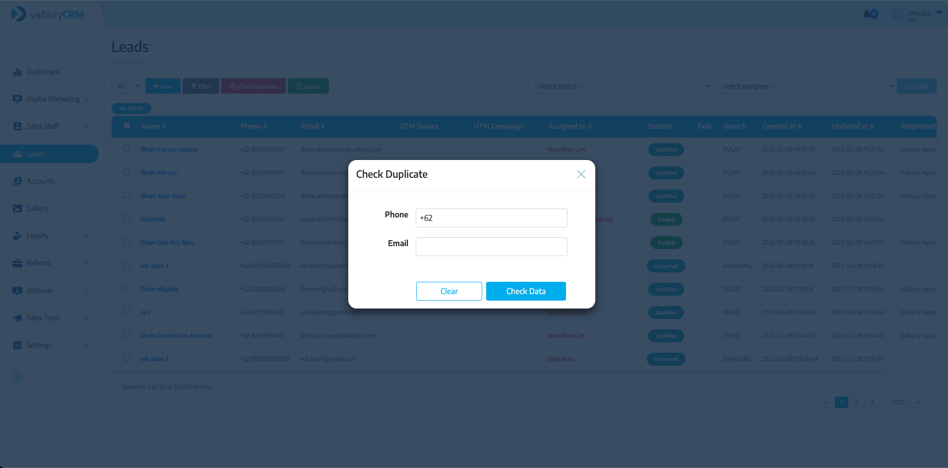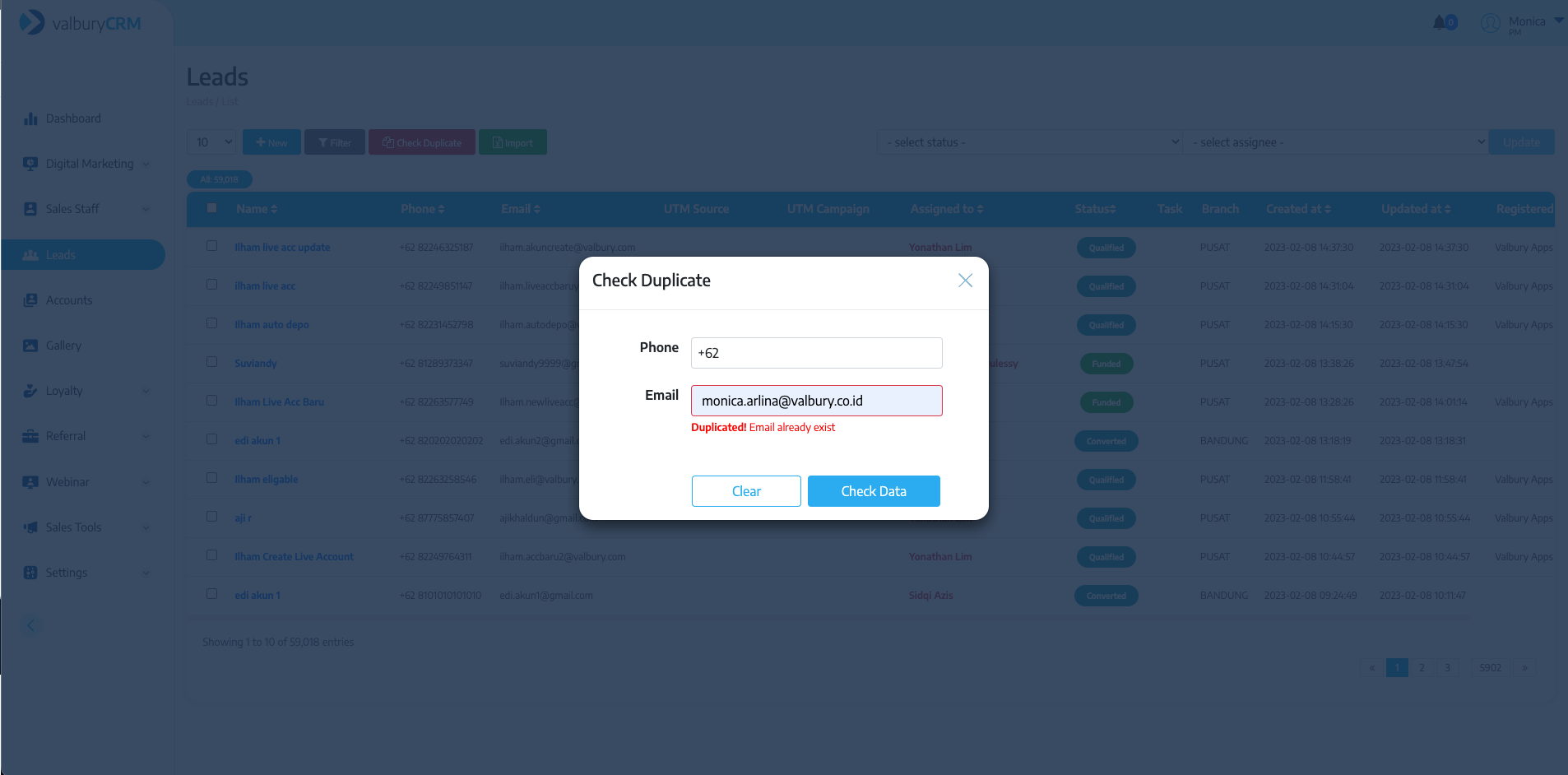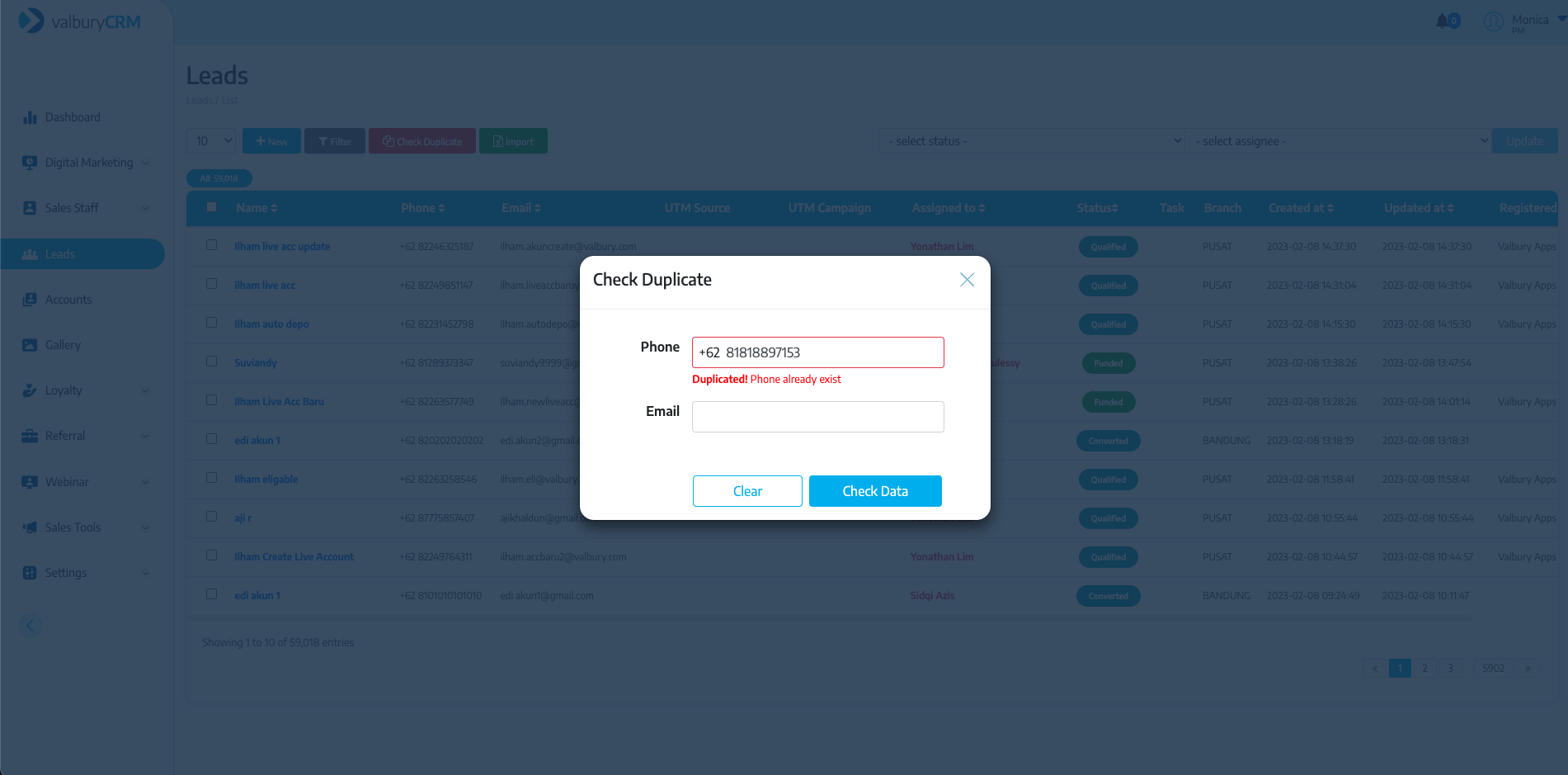 Jika Anda ingin memeriksa apakah calon nasabah yang Anda dapatkan sudah terdaftar dalam sistem atau belum, Anda dapat memeriksanya dengan mengklik tombol `Check Duplicate` dan mengisi baik alamat email atau nomor telepon. Jika sudah ada calon nasabah dengan email atau nomor telepon tersebut, Anda akan melihat peringatan bahwa nomor atau email tersebut sudah ada.