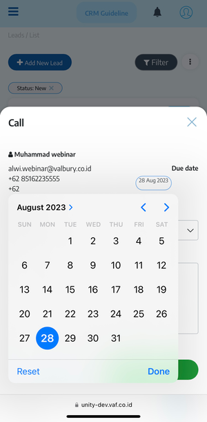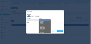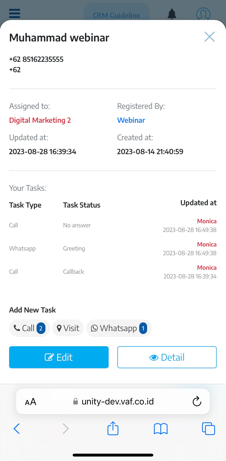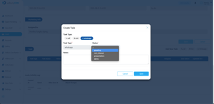 Untuk menambahkan task baru, pengguna perlu mengklik di antara tombol Call, Visit, dan Whatsapp. Kemudian pop-up akan muncul, Anda dapat menambahkan status task dan catatan.
